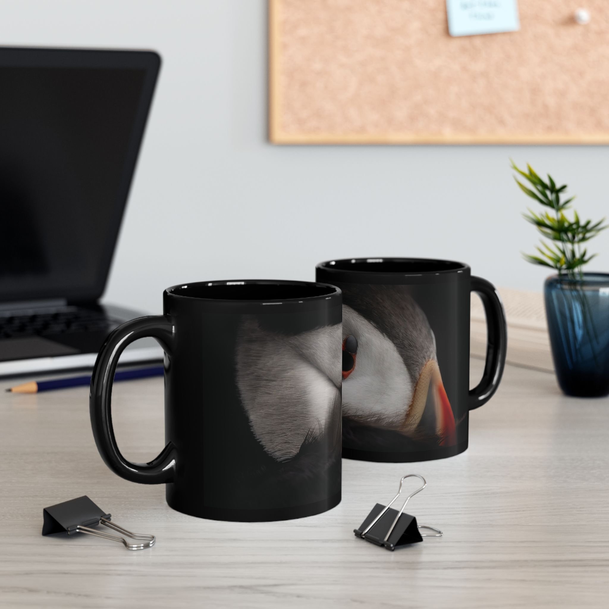 Puffin Portrait Black Mug — Close-Up Atlantic Puffin Photo Coffee Cup (11oz, 15oz)